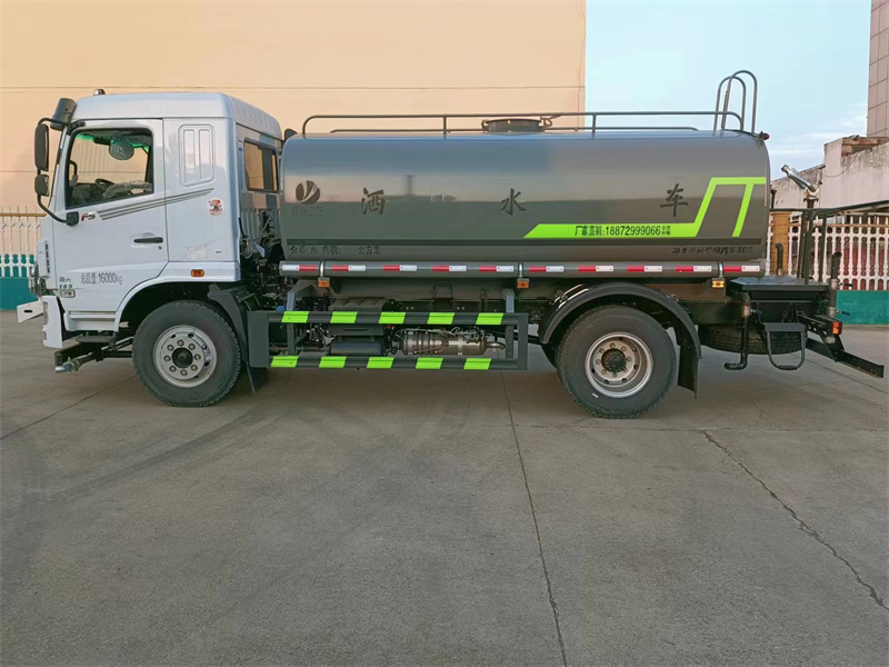 东风12吨洒水车产品配置 1.底盘配置: 发动机玉柴 165 马力(四缸),法士特 8 档变速箱,前桥 2.8 吨, 后桥 8 吨,9.00 钢丝胎,轴距 3950,断气刹,ABS,空调,气囊座椅, 电动玻璃,中控锁,行驶记录仪2.上装配置: 1、罐体约为 12 方, 2、边灯带电,罐体尾部上方标配 2 个红色示宽灯, 3、标配前喷为鸭嘴直冲,标配后冲,用户可根据自己的需求,来调 整对冲位置。 4、冲孔平台(承载能力加强),炮筒后盖为定制型螺栓卡扣, 5、前喷、后冲、后洒、侧喷,绿化高炮开关球阀均采用工程专用 50 大通径铜球阀, 6、新式轴承式水炮,更加耐用, 7、60-90 型水泵, 8、防腐法兰垫片, 9、铝制后洒,不易炸开 10、罐体自动焊(美国林肯焊机及电源),拼板自动焊接,封头环 缝焊接,无气孔,焊缝美观。 11、侧护网、后保险杠、均为螺栓连接,方便拆卸,维修方便。 12、塑料挡泥板,替代铁挡泥板,更加轻便,用螺栓连接,方便拆 卸。 13、前部、后部主管连接处为 6 孔圆法兰,不易冲垫