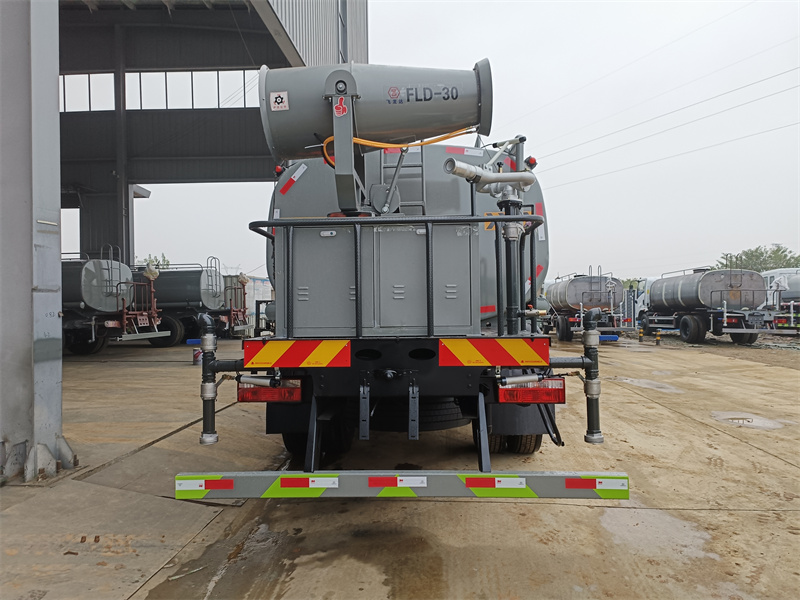 东风D9雾炮洒水车罐体约为 12 方,可加装 30-40 型雾炮 2、边灯带电,罐体尾部上方标配 2 个红色示宽灯, 3、标配前喷为鸭嘴直冲,标配后冲,用户可根据自己的需求,来调 整对冲位置。 4、花纹防滑平台,炮筒后盖为定制型螺栓卡扣, 5、前喷、后冲、后洒、侧喷,绿化高炮开关球阀均采用 50 大通经 不锈钢球阀, 6、新式轴承式水炮,更加耐用, 7、60-90 型水泵, 8、防腐法兰垫片, 9、铝制后洒,不易炸开 10、罐体自动焊(美国林肯焊机及电源),拼板自动焊接,封头环 缝焊接,无气孔,焊缝美观。 11、侧护网、后保险杠、均为螺栓连接,方便拆卸,维修方便。 12、塑料挡泥板,替代铁挡泥板,更加轻便,用螺栓连接,方便拆 卸。 13、前部、后部主管连接处为 6 孔圆法兰,不易冲垫