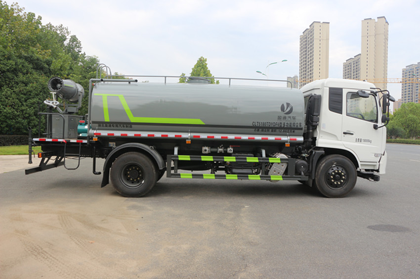 东风天锦15方雾炮洒水车底盘配置: 发动机康明斯 230 马力(六缸),法士特 8 档变速箱,D530 排 半标准顶,4.5T 前桥,9T 后桥 10.00 钢丝胎,轴距 4700,断气刹, 空调,电动玻璃。2.上装配置: 1、罐体约为 16 方,可加装 30-40 型雾炮 2、边灯带电,罐体尾部上方标配 2 个红色示宽灯, 3、标配前喷为鸭嘴直冲,标配后冲,用户可根据自己的需求,来调 整对冲位置。 4、花纹防滑平台,炮筒后盖为定制型螺栓卡扣, 5、前喷、后冲、后洒、侧喷,绿化高炮开关球阀均采用 50 大通经 不锈钢球阀, 6、新式轴承式水炮,更加耐用, 7、60-90 型水泵, 8、防腐法兰垫片, 9、铝制后洒,不易炸开 10、罐体自动焊(美国林肯焊机及电源),拼板自动焊接,封头环 缝焊接,无气孔,焊缝美观。 11、侧护网、后保险杠、均为螺栓连接,方便拆卸,维修方便。 12、塑料挡泥板,替代铁挡泥板,更加轻便,用螺栓连接,方便拆 卸。 13、前部、后部主管连接处为 6 孔圆法兰,不易冲垫
