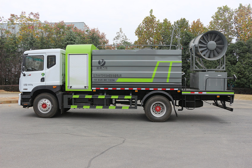 东风D9大型抑尘洒水车 整车型号 CLT5181TDYEQ6A 型多功能抑尘车 2 发动机型号 YCS04200-68 3 发动机马力/功率 玉柴 200 马力/147KW 4 发动机排量 4156ML 5 变速箱 法士特 8 档(带高低档) 6 轮胎规格 10.00 钢丝胎 7 轴距 4500 8 总质量 18000KG 9 整备质量 8900KG 10 额定载质量 8905KG 11 整车尺寸(长×宽×高) 8.68*2.5*3.8 12 罐体容积 12 方 13 燃料种类 柴油 14 排放标准 国六 15 水泵型号 60/90 16 罐体材质 Q235 碳钢产品功能展示 前冲鸭嘴 后洒 后对冲 高炮 侧喷 雾炮