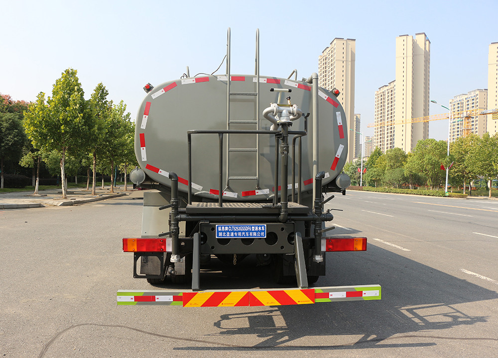 东风天龙20吨洒水车罐体约为 18.3 方, 2、边灯带电,罐体尾部上方标配 2 个红色示宽灯, 3、标配前喷为鸭嘴直冲,标配后冲,用户可根据自己的需求,来调 整对冲位置。 4、冲孔平台(承载能力加强),炮筒后盖为定制型螺栓卡扣, 5、前喷、后冲、后洒、侧喷,绿化高炮开关球阀均采用 50 大通径 不锈钢球阀, 6、新式轴承式水炮,更加耐用, 7、60-90 型水泵, 8、防腐法兰垫片, 9、铝制后洒,不易炸开 10、罐体自动焊(美国林肯焊机及电源),拼板自动焊接,封头环 缝焊接,无气孔,焊缝美观。 11、侧护网、后保险杠、均为螺栓连接,方便拆卸,维修方便。 12、塑料挡泥板,替代铁挡泥板,更加轻便,用螺栓连接,方便拆 卸。 13、前部、后部主管连接处为 6 孔圆法兰,不易冲垫