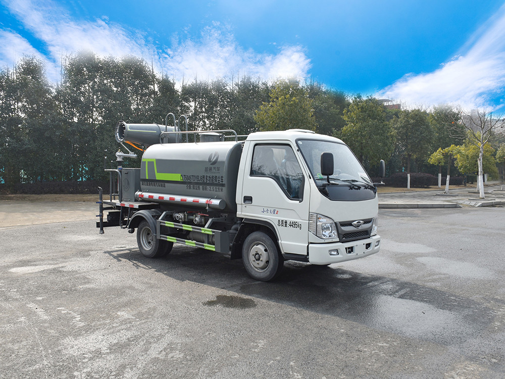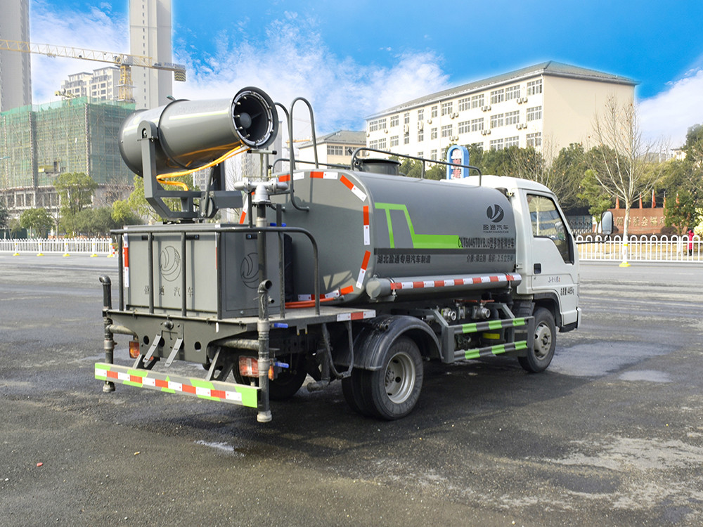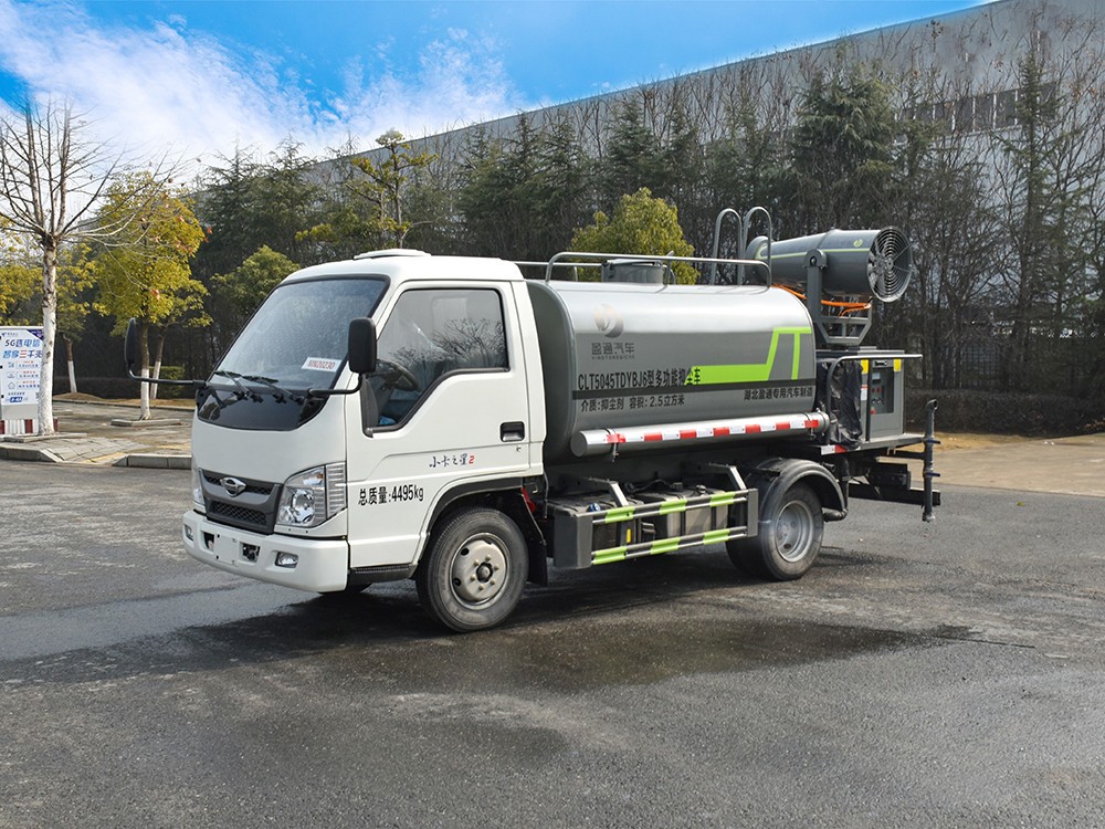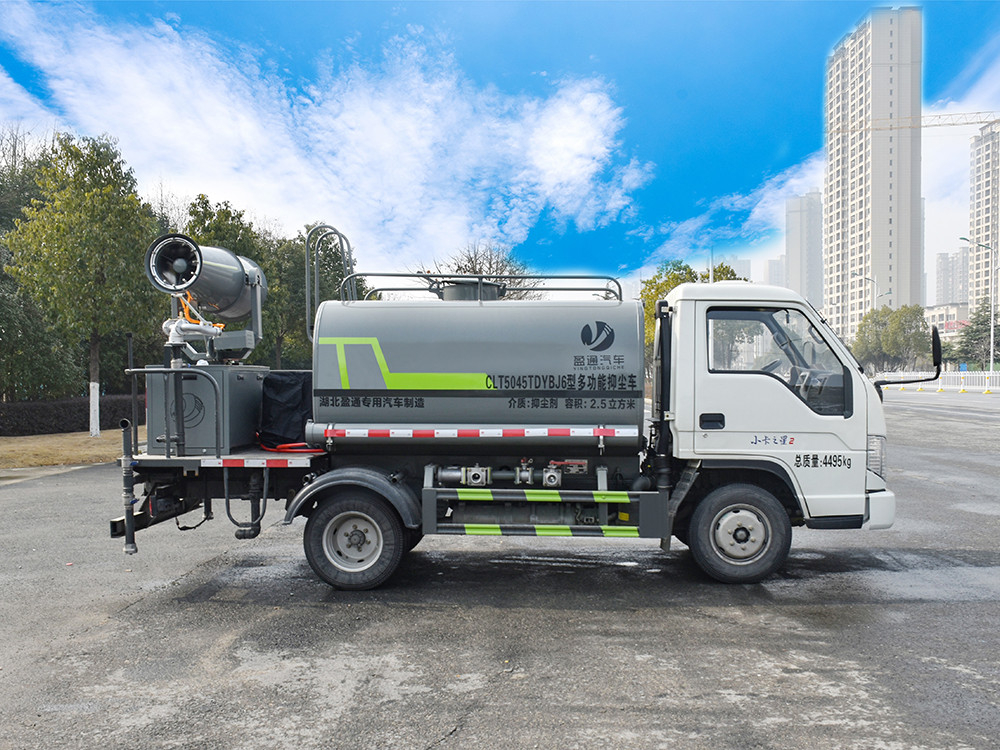3方雾炮洒水车 整车型号 CLT5045TDYBJ6 型多功能抑尘车 2 发动机型号 Q23-95C60 3 发动机马力/功率 全柴 95 马力/70KW 4 发动机排量 2300ML 5 变速箱 蒙沃 5 档箱 6 轮胎规格 6.00 钢丝胎 7 轴距 2600 8 总质量 4495KG 9 整备质量 2700KG 10 额定载质量 1665KG 11 整车尺寸(长×宽×高) 5.365*1.9*2.6 12 罐体容积 2.7 方 13 燃料种类 柴油 14 排放标准 国六 15 水泵型号 40/50 16 罐体材质 Q235 碳钢产品功能展示 雾炮 后洒 后对冲 高炮 侧喷
