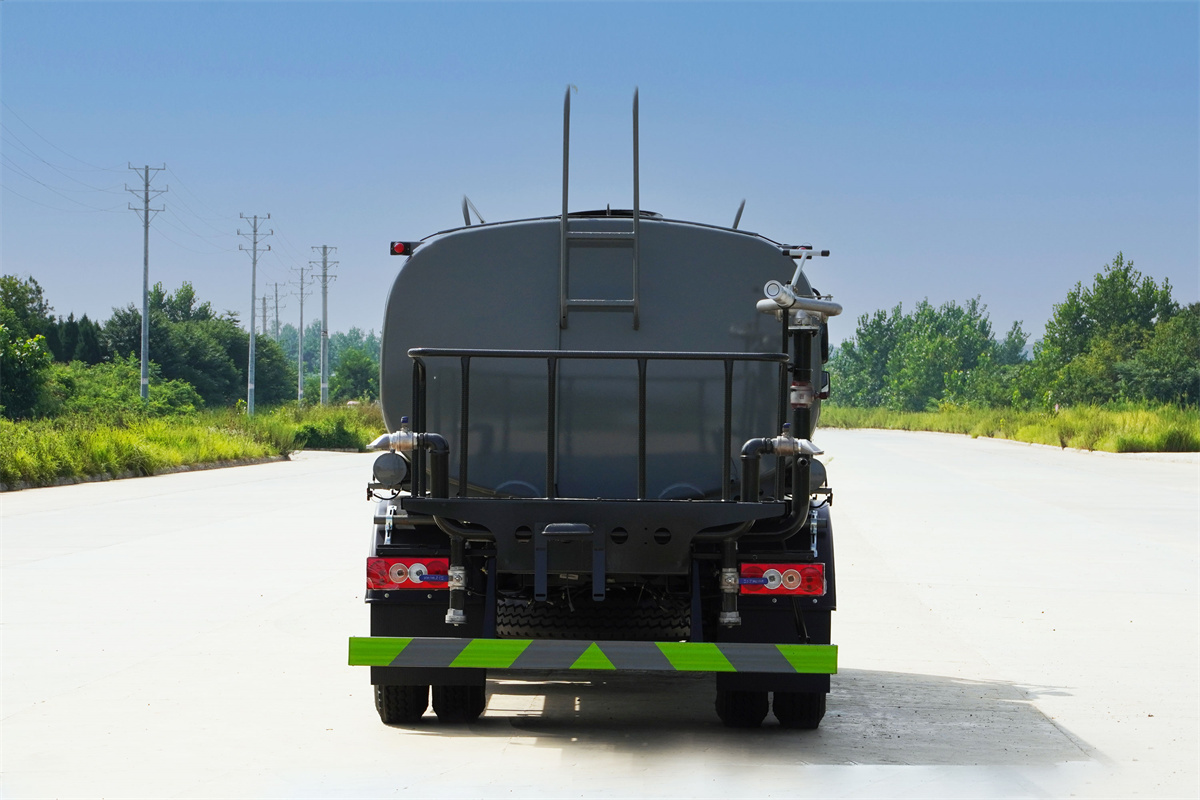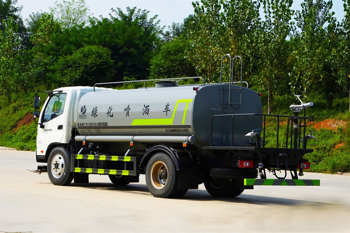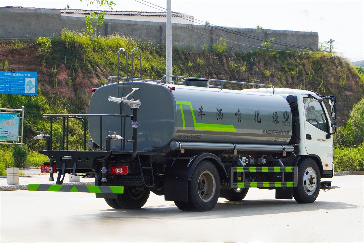 该车主要用于城乡园林绿化,路面喷洒,除尘和降温;主要装置为罐体及喷洒装置;罐体总容量7.56立方米,罐体有效容积:7.2立方米,罐体尺寸为(长×长轴×短轴)(mm):4200×2000×1310;ABS系统型号:ABS-VI.E;生产企业:广州瑞立科密汽车电子股份有限公司.ABS系统型号:ABS-E;生产企业:威伯科汽车控制系统(中国)有限公司;侧、后防护材料均为:Q235碳钢,连接方式均为:螺栓连接,后部防护截面尺寸(mm):120×50,后部防护离地高度(mm):450.随底盘选装驾驶室;采用3800mm轴距.选装前部电子炮样式,选装喷洒装置样式,选装前部鸭嘴喷洒样式,选装罐体顶部高位花洒装置,选装气动球阀安装位置.选装油箱电瓶安装位置.选装前部不带电子雾炮.当前部不带电子雾炮时,车辆长度7200mm,无前伸;当前部选装电子雾炮时,车辆长度7700mm,前伸500mm.选装箭头灯装置,后部作业灯仅在作业时开启,车辆行驶过程中不可开启.
