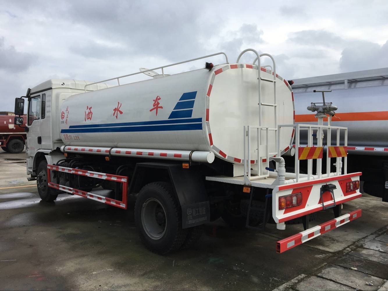采用国标武钢碳钢板材制作,罐体实际容积12立方,前冲(喷)、后洒、带侧喷(花洒),带后工作平台,平台上安装钢制芯专用大功率绿化洒水高炮(炮有直流状、大雨、毛毛雨、雾状可调节,可喷洒农药),配备大功率专用洒水泵,带消防接头,带自流阀,带自吸功能。同时可以用于临时应急消防洒水,每辆洒水车都配备消防专用接口。由发动机带动变速箱,变速箱上安装的取力器带动洒水泵,洒水泵产生主要动力,将罐体内部的液体通过管网喷洒出去。自吸高度:≤7m,洒水宽度:≥20m,最大射程:≥28m;可调节成柱状,射程≥28m;也可调节成雾状,射程≥15m。前喷后洒,前装有鸭形喷嘴或圆头冲嘴,后面装有圆柱开洒水喷嘴或莲蓬头喷嘴,后部有一工作平台,装配有高压水炮。后部还可装8个喷嘴(选装)喷水器一般用于冲洗街道。可选配药盘、打药机。也可加装药盘、药泵、罐内防腐防锈、多方位进出水接头、电磁阀、气动阀等先进设施,以满足不同用户需求。