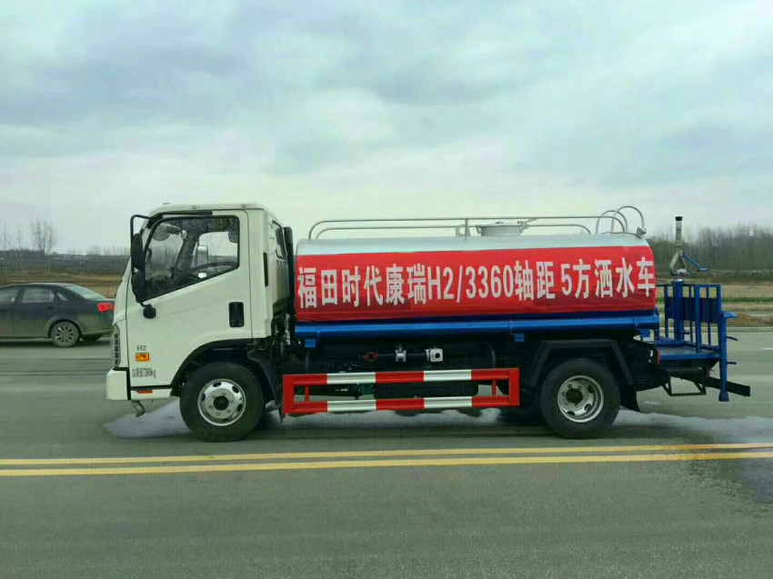 福田时代5吨洒水车,罐体实际容积5立方,凡是购买该车的用户,洒水车厂家立送7天临时牌照一份,洒水车的所有功能配件,均享有一年的质保期,质保期内免费更换,