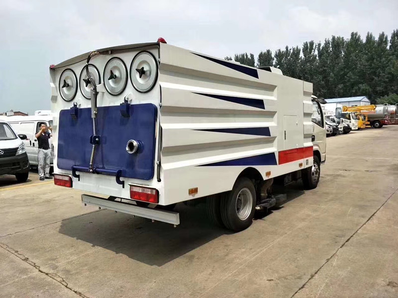 扫路车上装配置:中置4扫盘、后置吸盘、三洋马达、江铃五十铃副发动机、施耐德控制开关、海普瑞思电磁阀组、无极变速自动离合器、免维护离心式风机、不锈钢垃圾箱、北极星电子水泵、垃圾箱举升自卸、尾部LED箭头灯、手动泵应急系统。可选装前冲后洒、垃圾箱自洁功能、倒车影像作业监控、前置雪铲、扫雪滚。