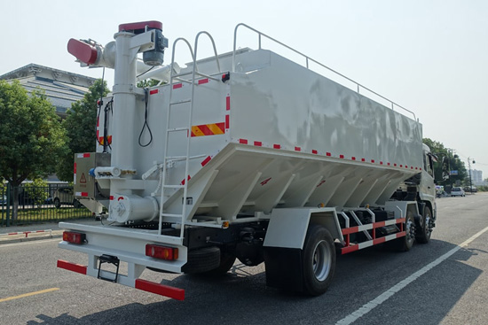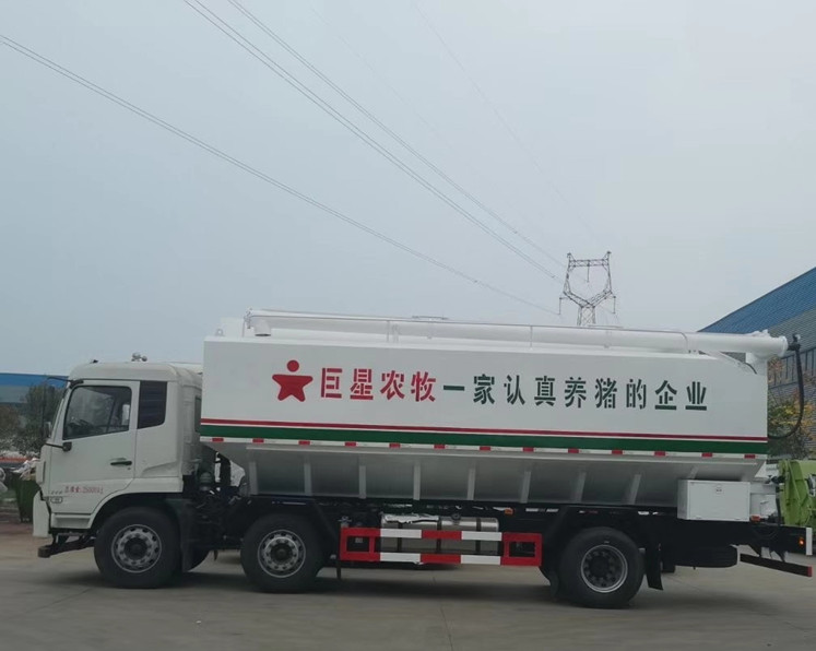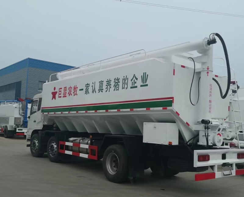 国六东风天锦小三轴散装饲料运输车-30方散装饲料车:东风天锦VR驾驶室,康明斯245马力发动机,法士特8档变速箱,1800+5000mm/1800+4100mm轴距,11.00R20钢丝胎,电动门窗,中控锁,原厂空调,ABS,方向助力,铝合金挡泥板,带环保和燃油,上户办营运证无忧!上装采用武钢优质碳钢板,三条绞龙,顶部绞龙可180度旋转,分设四个仓,可独立控制各个仓的卸料顺序和速度!