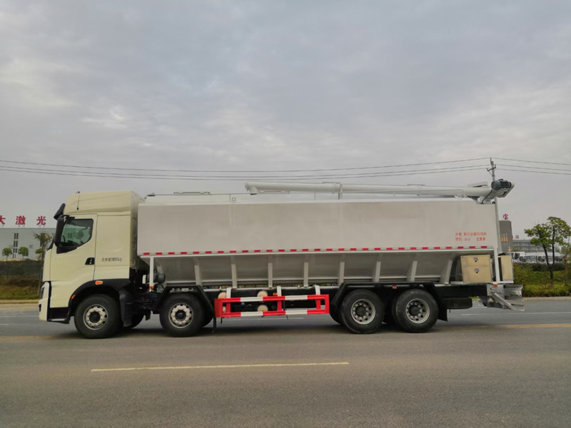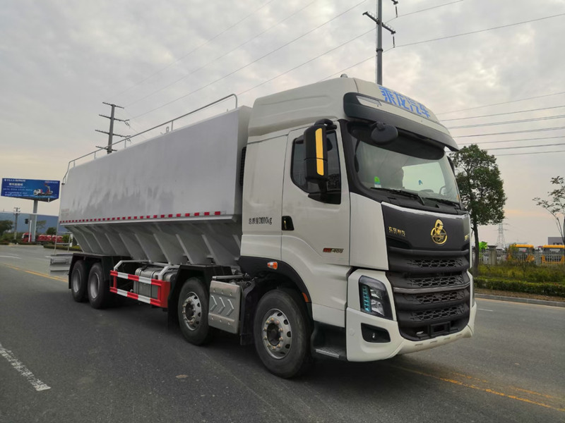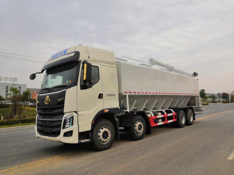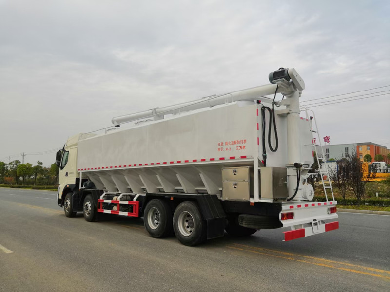 柳汽乘龙前四后八散装饲料运输车/40方养殖场饲料配送车整车型号:XBZ5310ZSLL6,柳汽H7驾驶室,玉柴460马力国六发动机,法士特12档铝合金变速箱,5.5T双前桥,440双后桥,12R22.5,全气囊悬浮驾驶室,电动玻璃、LCD液晶仪表、自动空调、真皮多功能方向盘、定速巡航、ABS、中控锁、自动调整臂。整车尺寸:12000×2500×3995mm。/40方散装饲料车