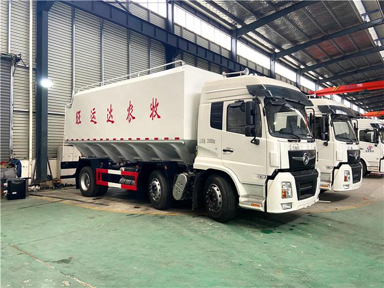 散装饲料运输车主要用于从饲料厂向畜牧场养禽场及饲料加工用户运输散装饲料成品或饲料生产原粮,同时它也可用来运输某些无腐蚀性粉粒状原料,如制药厂粉料和粮库周转。散装饲料车的饲料罐架设在卡车的底盘上,罐顶开有进料口.顶部的一根螺旋输送卸料管(俗称卸料绞龙),可控制旋转和抬升,抬升的仰角可达60度,并且可以左右旋转180度。运输时,顶部的螺旋管平卧在罐顶;卸料时则抬起,使管端的出料口与畜禽饲养场贮料罐顶部的进料门相接,驾驶室内装有操纵装置(操纵装置也可装置在罐体尾部),卸料时通过车底的动力输出轴和减速器来驱动螺旋,以完成卸料。目前国内主要推出12-18方、20-28方、30-38方、40-48方、55方及以上半挂等多个吨位车型。