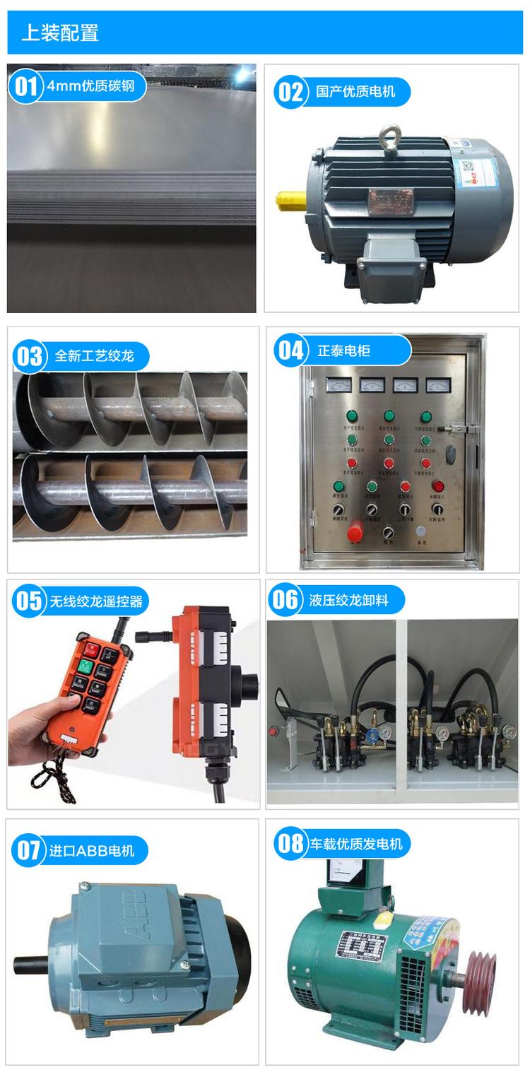 散装饲料车有整车式和独立罐式(可用相应载货车运输)等。按驱动形式分有:电动卸料散装饲料车、全液压卸料散装饲料车。