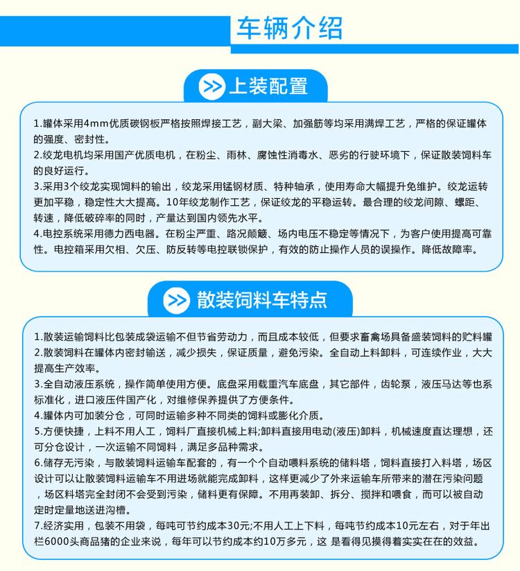 车辆参数配置:40方电动散装饲料运输车,采用解放前四后六底盘, 1900+4160+1350 轴距,锡柴 260/290 马力,陕齿 9 档变速箱,295 真空胎,电动门窗中控锁,电动举升,ABS,方向助力,上装罐体容积约40立方,罐体采用4mm 钛钢板制作,罐体内分为肆个仓,可独立控制各分仓卸料顺序和速度,整车3条蛟龙(底部水平绞龙、尾部垂直绞龙、顶部卸料绞龙),由3个5.5kw 380v电机带动各绞龙工作,顶部绞龙液压控制举升,可左右旋转180°,整车尺寸:11000*2550*3995,罐体尺寸:8000*2550*2500,液压款散装饲料运输车,通过变速箱带动取力器取力后带动各绞龙工作,采用进口液压系统,确保产品质量,延长使用寿命