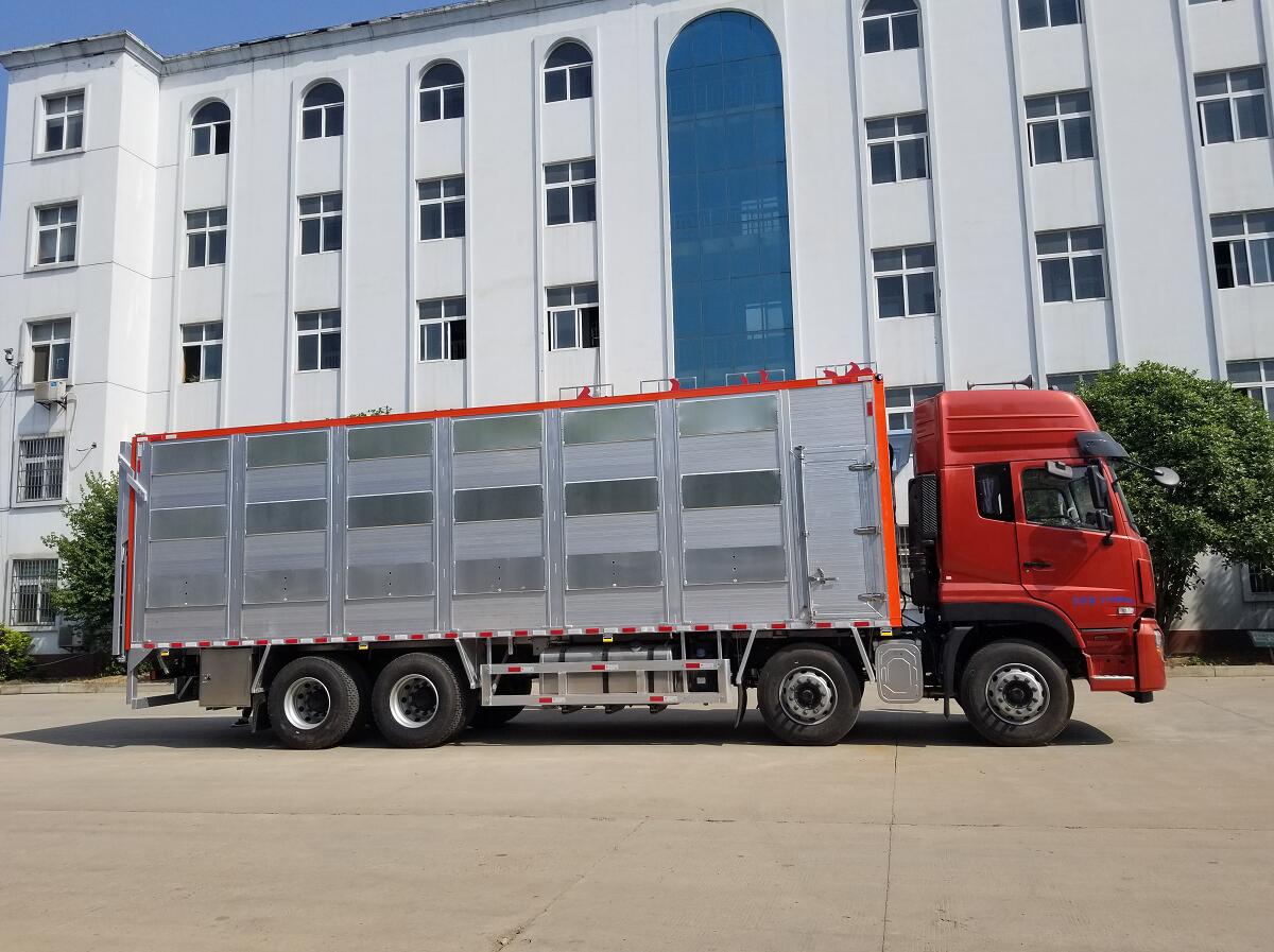 东风天龙前四后八全铝合金运输车,又称铝合金禽畜运输车,可做三层或四层,品质更佳,车身结构采用铝合金打造,不锈钢喷头和饮水头,相比钢制车体,重量减轻20%-30%,可以装载更多的畜禽,空车行驶节约燃料,低维保费用,不生锈,生命周期无线延长,无需漆面保护,清洁简单便捷,操作简易,车厢升降平台由全液压控制,遥控操作更加简便,自动恒温系统,车厢设计合理方便控制家禽上下车,遥控升降车,动物福利,更大的 内部空间,家禽在车厢内更感舒适,温度控制系统,冲淋饮水系统,遥控侧面通风系统,可开合侧窗系统,强制通风系统。