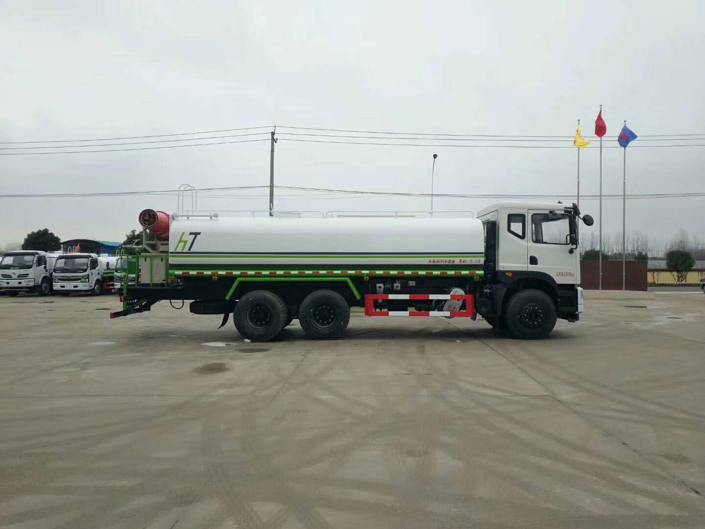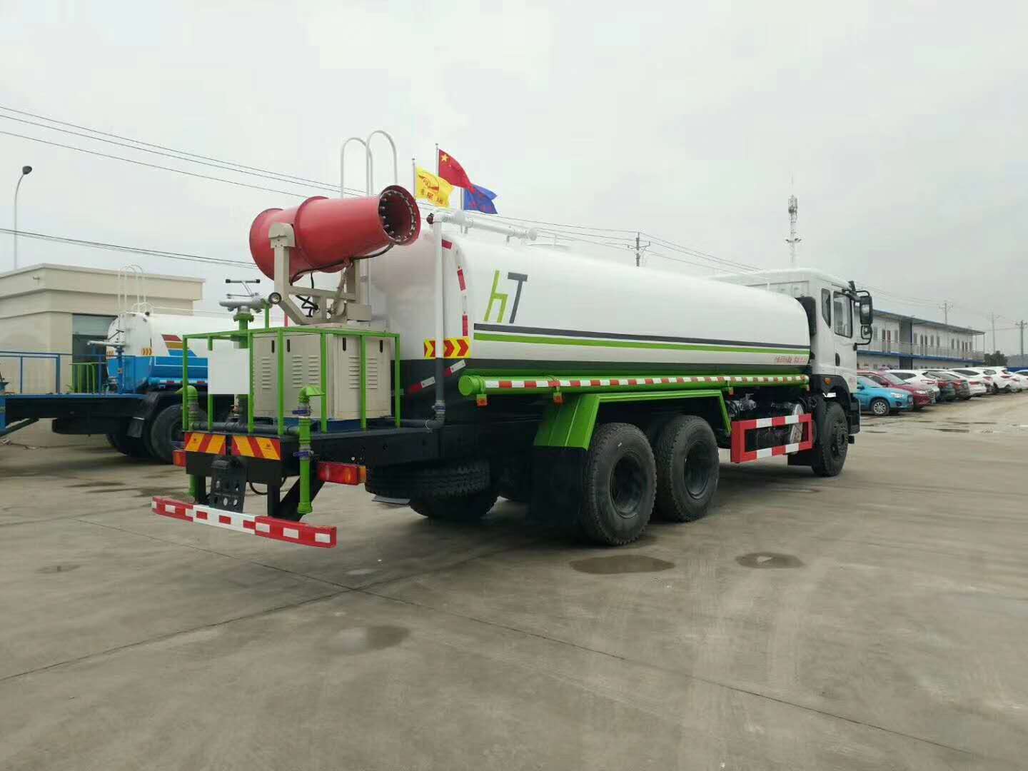 整车说明:选装驾驶室,驾驶室遮阳板为选装件.选装后高位花洒,选装方圆管道箱,选装后雾炮装置,选装后弧形喷雾.选装LED箭头指示灯,选装后平台式样,选装喷枪安装位置。仅采用4350+1350轴距底盘。罐体有效容积15.75立方米;运输介质:水,密度:1000千克/立方米;罐体外形尺寸(长度×长轴×短轴)(mm):6500×2280×1550。侧防护采用冷弯型钢/Q235,螺栓连接。后防护采用冷弯型钢/Q235,焊接连接。后防护截面高度尺寸120mm,截面宽度尺寸50mm,下边缘离地高度500mm。ABS型号/生成厂家:3631010-C2000/东科克诺尔商用车制动系统(十堰)有限公司。专用装置主要是罐体和喷洒系统,用于园林绿化,喷洒作业.选装后平台样式,外观样式及左右出水口附件位置。