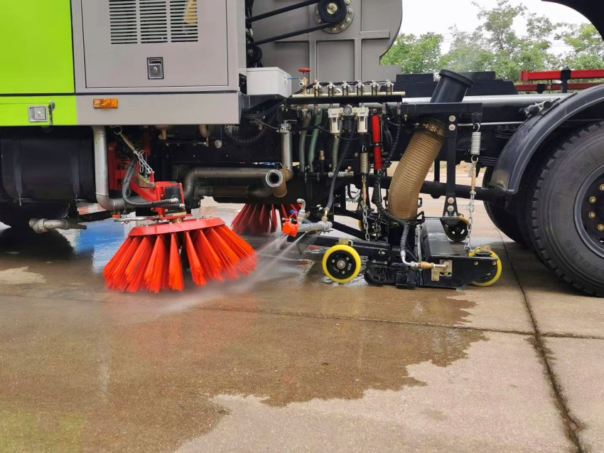 洗扫车:清扫作业装置工作的同时,副发动机驱动配有专用离合器的高压水泵参与工作。高压水泵将来自清水箱的清洁水加压后通过高压管路控制阀等分别输送到吸嘴内喷水杆和左、右喷水杆,各喷杆上装有多个特制的不锈钢扇形喷嘴,扇形喷嘴喷出的扇形水帘组成一总宽不小于3.5m的U形水刀,直接冲洗路面,冲洗路面后的水被吸回到垃圾箱中,实现路面洗扫