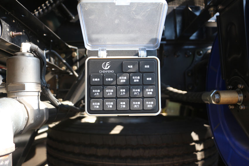 带2个中置扫盘,康明斯170马力副发动机;大力马达;德国高压水泵(前冲/侧喷/中喷/后喷雾(不锈钢喷嘴)/侧冲洗水枪/垃圾箱自洁装置);万向高压路沿清洗;台湾液压阀组;威龙低压泵(前冲);4mm不锈钢垃圾箱;不锈钢水箱;不锈钢高压管路;双层不锈钢吸尘筒;德国控制器;美国传感器;尾部箭头灯;机油、垃圾箱、水箱均带防溢或低位报警装置;倒车及洗扫状态室内监视器;倒车防撞自动保护装置;检修安全保护装置;扫刷臂转动机构使用高新耐磨工程隔套,免打黄油;20m高压冲洗卷盘。集成式运动控制器,一键电脑控制。