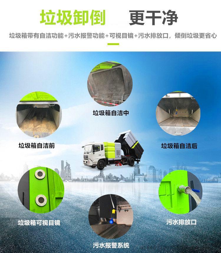 洗扫车上装配置:加装副发动机、风机、清水箱、垃圾箱、左右立扫、后置吸盘,扫盘降尘系统,液压系统、专用装置电控系统和副车架等改装而成(可加装前冲后洒,可以根据客户要求做成方形、圆形箱体。)