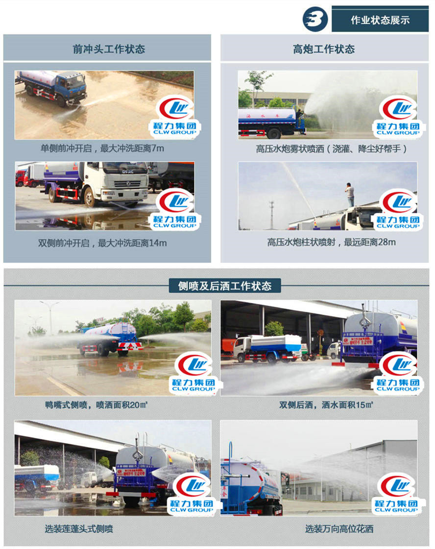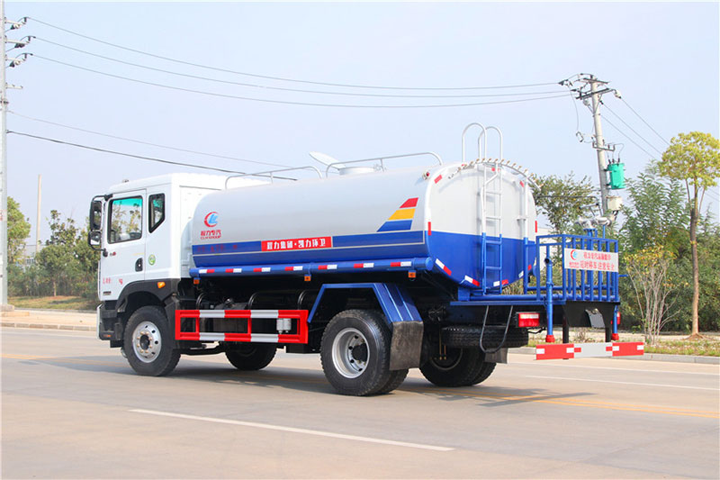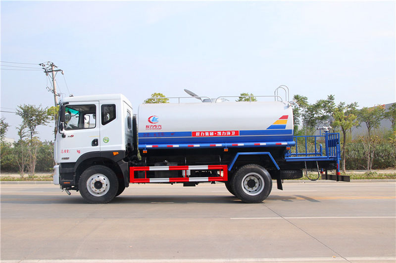 洒水车专用配置:罐体容积 13立方,罐体采用国标Q235碳钢材质,罐体厚度4MM,前后封头5MM加厚型,罐体内双层隔板具有防波荡作用,以减轻汽车行驶时罐内液体冲击;洒水车整车及外形尺寸严格按照国家机动车公告制作而成;装配大功率专用洒水泵,前冲、后洒、侧喷、后平台带绿化洒水炮,洒水炮可全方位旋转,可连续调成直冲状、大雨、小雨、毛毛雨;配消防接口,自流阀,滤网,带自吸自排功能。前封头带水位计,后平台主管路带1寸浇花接口,后爬梯,带1个消防接头,带1个自流阀,1个过滤装置,其余标配。1、可选装后平台带雾炮机组用于喷雾降尘、农药喷洒作业;2、可选装前置电子洒水炮驾驶室操作;3、可选装气动球阀驾驶室操作。