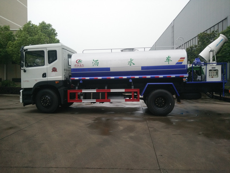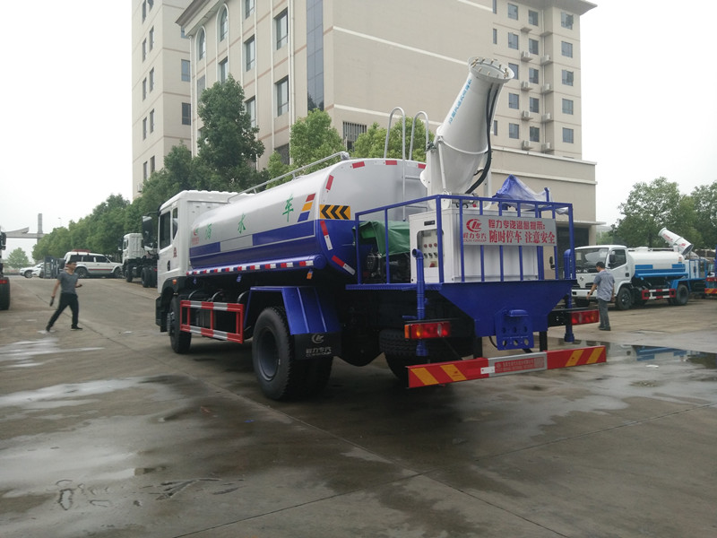 洒水车配置前冲、后洒、左右侧喷水、带后工作平台、平台上安装绿化洒水高炮(炮喷射形状可调节:直冲、大雨、中雨毛毛雨、雾状、可连续调节,360°旋转),配消防接口,自流阀,滤网,带专用洒水泵具有自吸自排功能洒水宽度≧14-16米,射程25-30米,带增压,方向助力。罐体采用优质碳钢制作。带两根输水软管