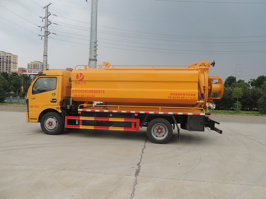 东风清洗吸污车吸污部分:吸污罐采用6mm武钢碳钢制作,容积约7方,带视污窗,洗手装置,安装有防溢阀,SK-12水环式真空泵(选装油泵),带8米4寸吸污钢丝橡胶管,罐尾配100mm排污球阀,罐体带液压举升系统,后盖液压打开、关闭,带自卸功能,可进行加压强排。罐体内带隔衬板,防止吸污罐体变形。