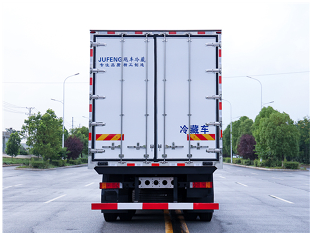 东风天龙9米6冷藏车厢体配置为:断桥隔温工艺,整体结构框架,内外面料为3mm新款哑光玻璃钢夹保温层真空复合而成,厢体厚度为8cm,最新款铝合金包边型材,型材局部厚度为4mm(钢制铆钉加固),厢体内部采用2个LED照明灯及厢体示宽灯,后门框不锈钢材质,门框密封条为三元乙丙橡胶材质,加厚型不锈钢合页及锁件;副梁为Q700车用大梁钢,15mm厚大梁垫皮,加装防撞胶块,不锈钢门锁件,配后双开门,副驾驶一侧居中靠前开单侧门一个,带2个排水孔。