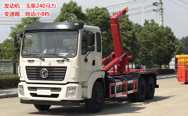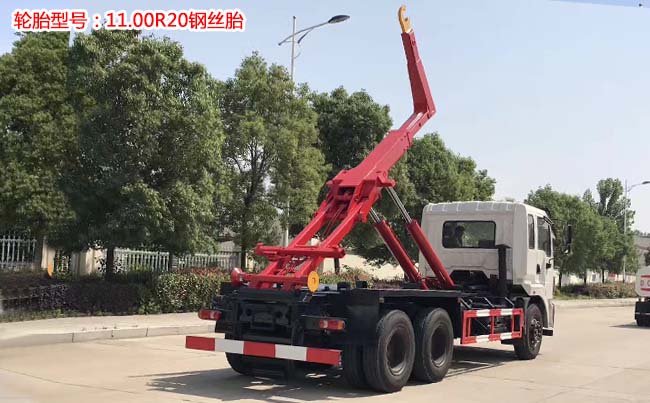 东风后双桥勾臂式垃圾车,齐星驾驶室,玉柴240马力发动机,陕齿小8档变速箱,轴距4350+1300轮胎,前桥5吨,后双10吨,11.00R20钢丝胎,带ABS,下防护。