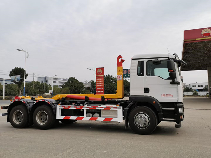 重汽汕德卡后双桥勾臂式垃圾车,潍柴270马力,G5-M系列驾驶室,轴距:4300+1350,9档变速箱,5.5吨前桥,11吨双后桥,280大梁,11.00R20钢丝胎,300L铝合金油箱,四通道ABS,博世方向机,气囊座椅,电动玻璃,中控锁,摇控钥匙,可调节多功能方向盘,电动调节带加热后视镜。勾臂式垃圾车公告、环保齐全。