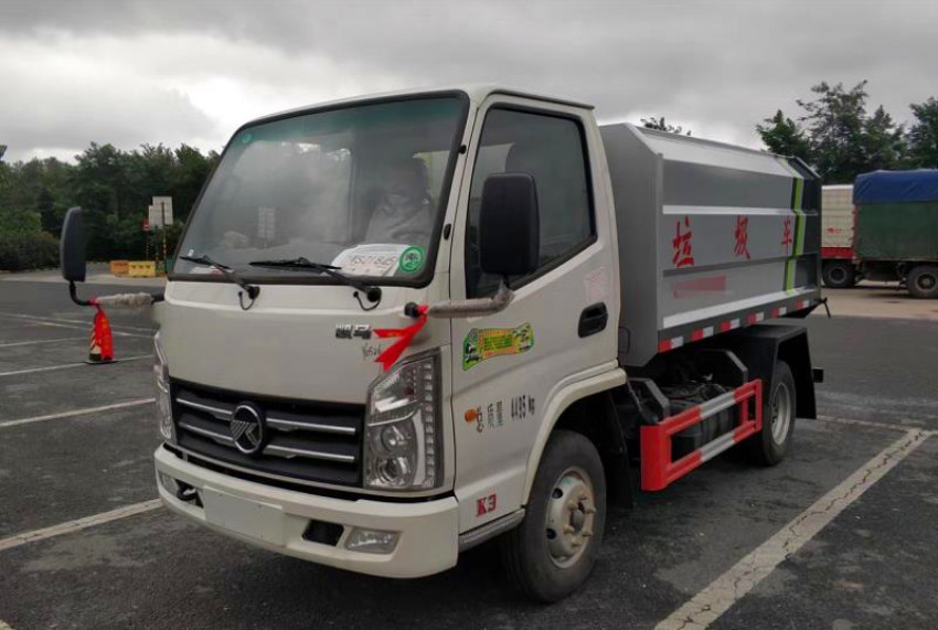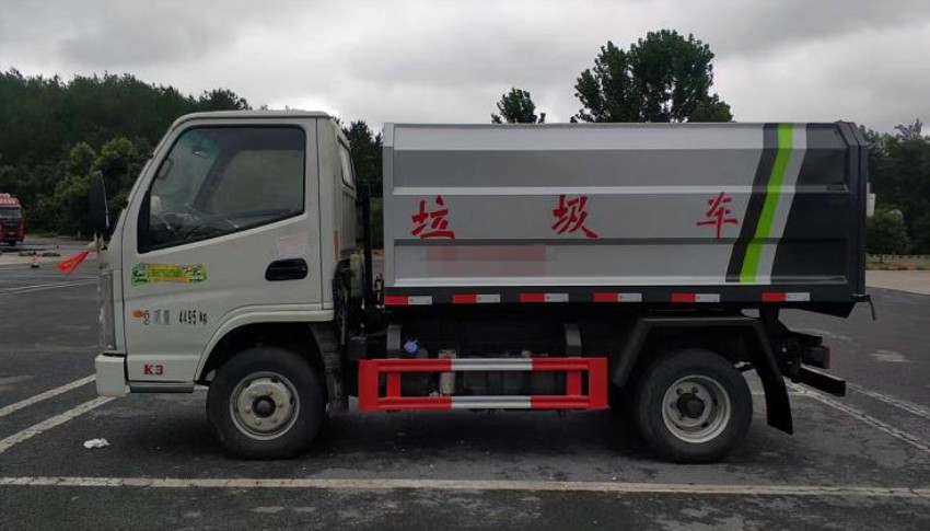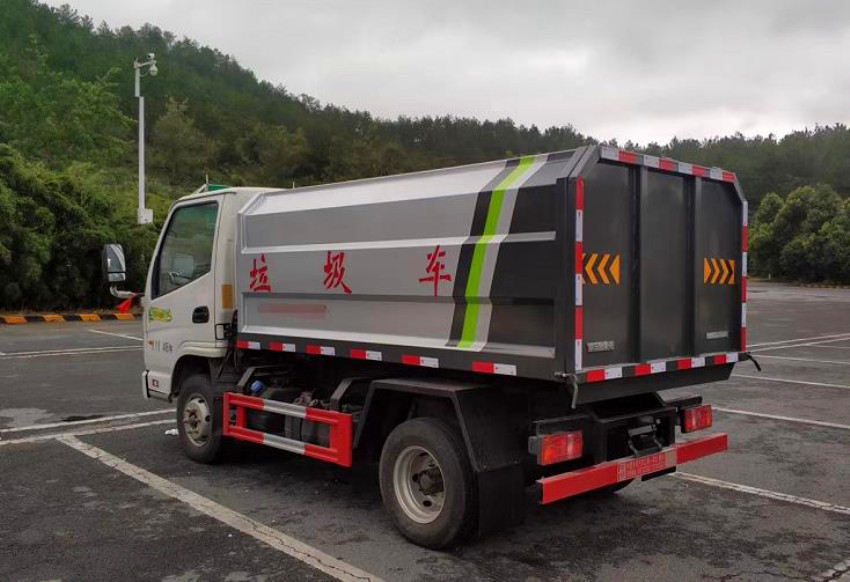 箱体容积3~4立方米,碳钢边三底四,国产油泵、多路阀、取力器、油缸,卸料方式为底部双杠液压举升自卸,驾驶室外操作,铁桶挂架,后门机械锁紧,手动开门,可选液压开门。