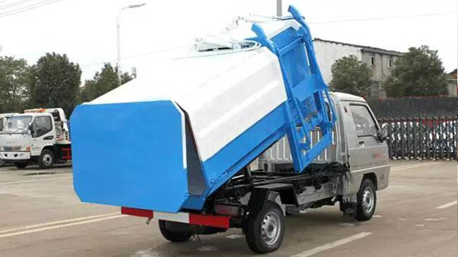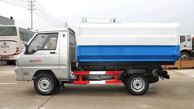 箱体容积2~3立方米,全密封式垃圾箱体,采用碳钢边三底四焊接制作,边板折弯强化,箱体右侧配液压挂桶提升机,国产油泵、多路阀、取力器、油缸,卸料方式为底部双杠液压举升自卸,驾驶室外操作,铁桶挂架,后门机械锁紧,手动开门,可选液压开门。