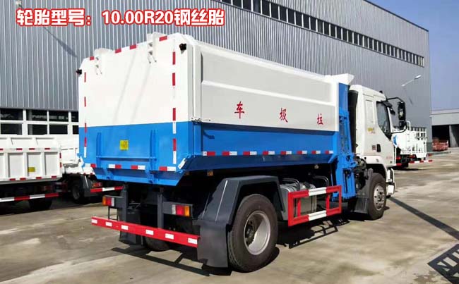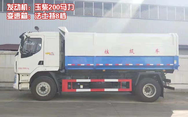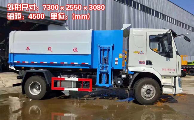 改装容积14立方米,密封式垃圾箱,后盖手动开启,挂桶提升机构采用链条、液压油缸联动装置,实现将垃圾箱提升翻转,可将多个垃圾桶收入车厢内,箱体底部采用双液压油缸举升自卸,将垃圾自卸倒出。