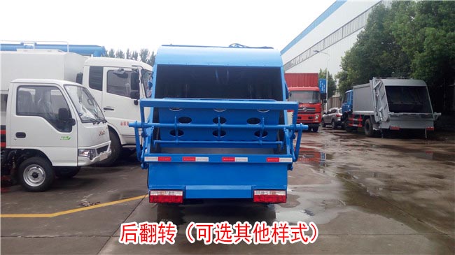东风3吨压缩式垃圾车选装配置: 1、挂桶式翻转结构。2、全落地式垃圾斗。3、簸箕式垃圾斗。4、摆臂式垃圾斗。