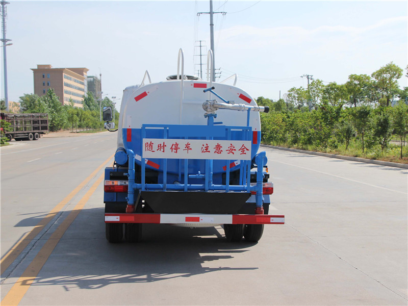 上装配置:罐体采用4毫米厚武钢产容积板焊接而成,内设防浪板,程力大功率洒水泵,可自吸水,加压排水,前冲15米宽,后洒压尘,侧喷花洒喷头,尾高绿化高位水炮,射程28米,可调节水柱、大中雨、毛毛雨等,可做临时消防灭火用。