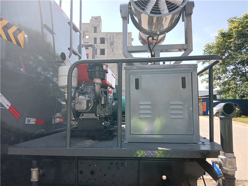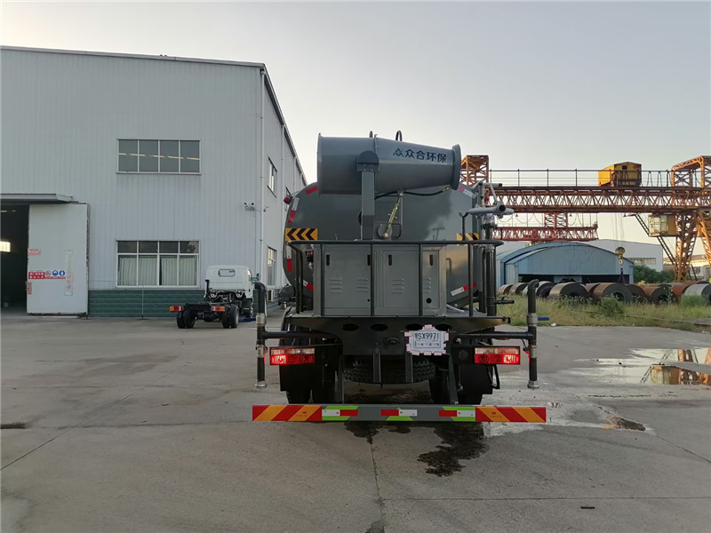 2、前部安装鸭嘴式喷头两个,后部带锥形对冲喷头两个,后工作平台上部左右各安装花洒喷头1个,后平台下部左右各安装后洒砣喷头1个,罐体右侧上端安装高位花洒喷头两个,平台上安装绿化洒水高炮,炮可旋转,可连续调成直冲状、大雨、小雨、毛毛雨,带安全护栏。罐体右后部带自上水装置,带自流阀。
