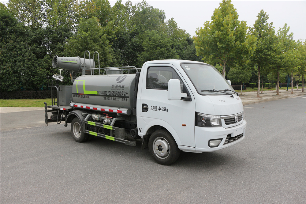 整车说明:该车用途为抑尘降霾.主要装置为罐体及喷雾装置;罐体有效容积:2.11立方米,罐体外形尺寸(长×长轴×短轴)(mm):2300×1350×950;选装喷雾装置。ABS型号/厂家:APG3550500A/浙江亚太机电股份有限公司;选装ABS厂家及型号:襄阳东风隆诚机械有限责任公司/ABS/ASR-12V-4S/4M.侧、后防护材料均为:Q235碳钢,连接方式均为:螺栓连接,后部防护截面尺寸(mm):120×50,后部防护离地高度(mm):380.
