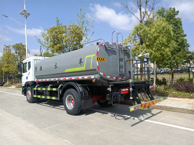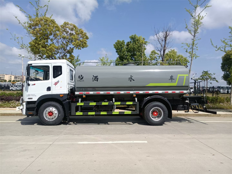 东风12方洒水车标配前喷(鸭嘴)、后冲、后洒、侧喷、后置式工作 平台,平台上配置绿化水炮(可 360°旋转,既可以调成柱状,也可 以调成雾状,更可以调成直冲状、大雨、中雨、小雨、毛毛雨),配 备优质大功率专用洒水泵(可自吸自排,可从河里或池塘抽水到罐体), 取力器,杂物过滤网,消防接口,自流球阀系统、取力器、球阀、滤网 均为国家标准产品
