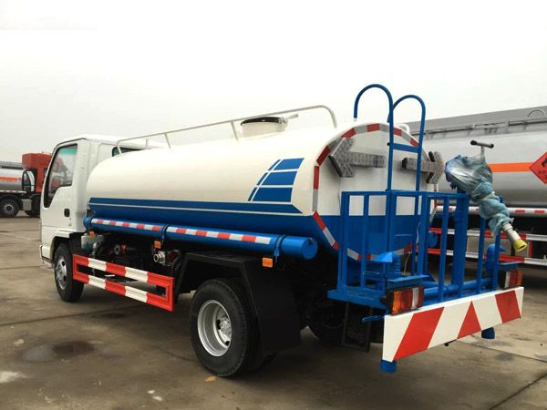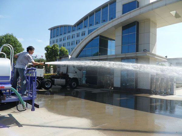 洒水车前装有鸭形喷嘴或圆头冲嘴,后面装有圆柱开洒水喷嘴或莲蓬头喷嘴,后部有一工作平台,装配有水炮。后部还可装8个喷嘴(选装)。