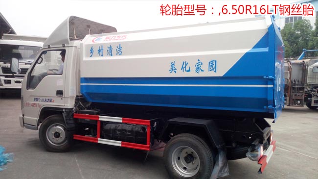 垃圾车上装配置:全密封式垃圾箱体,采用优质武钢产碳钢板焊接制作,边板折弯强化,箱体右侧配液压挂桶提升机,可挂国标120升或240升塑料垃圾桶,提升速度快,稳定性高,尾门弹簧锁扣带橡胶密封条,箱内设污水栏,箱体双缸液压自卸,多路阀手柄操控。