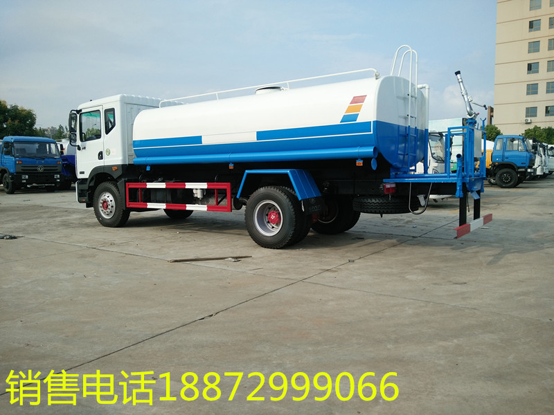 东风D9洒水车(12吨)罐体用4MM碳钢板制作,罐内隔板具有防波作用,整车带一个专用洒水泵(垂直最大吸程6米),洒水宽度14米,射程28,配备2个前冲、2个后洒、2个侧喷、带1个后工作平台,平台上安装1个绿化洒水高炮(洒水炮可全方位旋转,可连续调成直冲状、大雨、小雨、毛毛雨,雾状可调节冲洗高大树木),引水时间<5min,流量90m3/h。带1个消防接头,带1个自流阀,1个过滤装置、人性化爬梯及侧防护栏,安装洒水音乐喇叭。