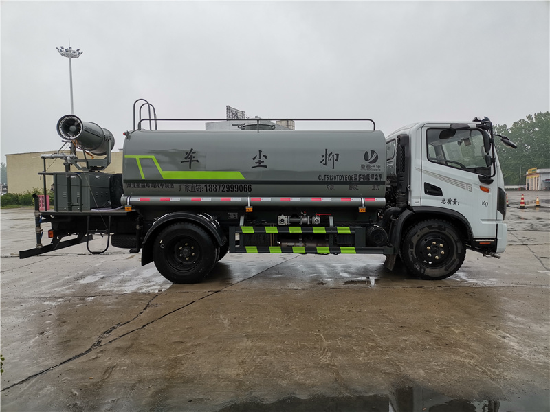 选装喷雾装置样式。该车用途为抑尘降霾,主要装置为罐体及喷雾装置;随底盘选装驾驶室; 罐体有效容积:10立方米;罐体外形尺寸(长×长轴×短轴)(mm):4000×2100×1400,4000×2000×1320; ABS型号/厂家:ABS型号及生产厂家为:3631010-C2000/东科克诺尔商用车制动系统(十堰)有限公司,J ABS/焦作博瑞克控制技术有限公司;侧、后防护材料均为:Q235碳钢,连接方式均为:螺栓连接, 后部防护截面尺寸(mm):120×50,后部防护离地高度(mm):450. 品名称:国六东风10吨洒水车壹台。 雾炮车具体配置:底盘部分,采用原厂东风底盘,云内150马力发动机,3800mm轴距,万里扬6档变速箱, 8.25R20轮胎,国六排放标准,带空调,专用部分,罐体采用优质碳钢材质制作,带两个前冲喷头、 两个后洒喷头、两个侧喷、后工作平台、尾部安装绿化炮,绿化炮可以自行调节(柱状,大雨,中雨,小雨,雾状), 带专用洒水泵可以实现自吸自排,带消防接口,两根输水管,加装30型柴油雾炮, 带底盘合格证和整车合格证。