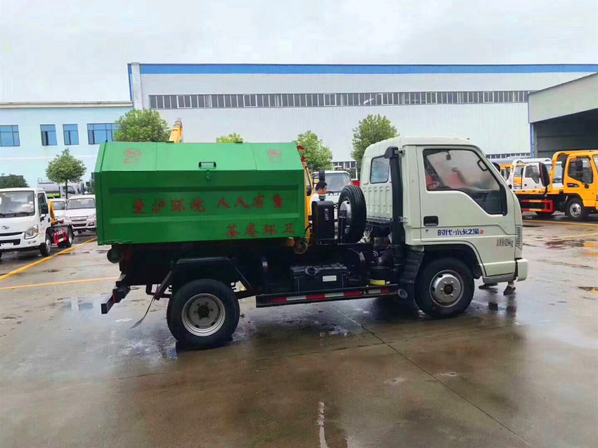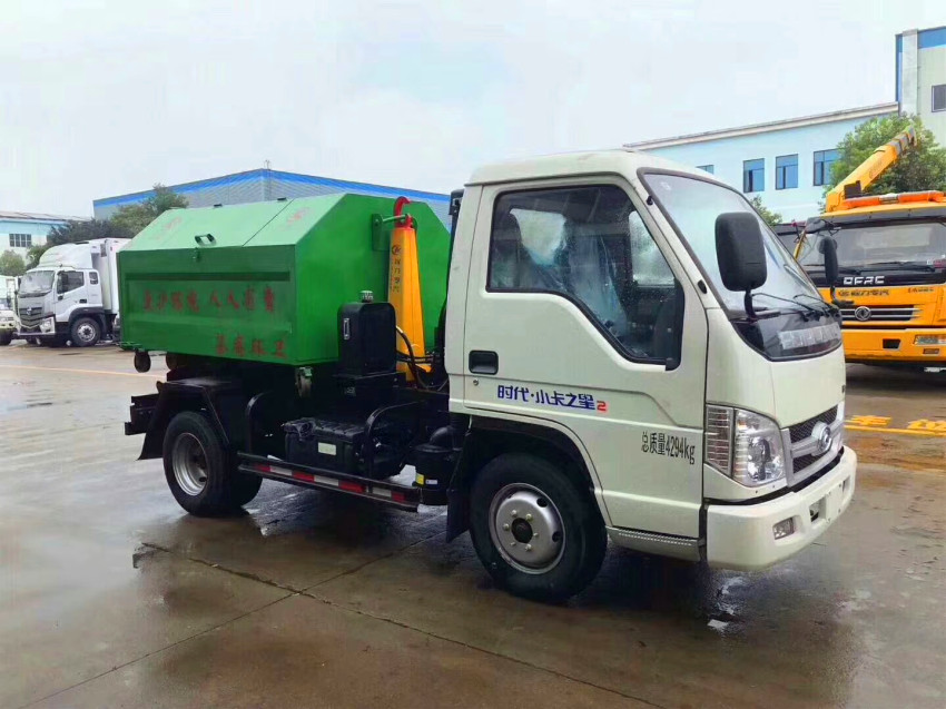 福田勾臂式垃圾车基本详情采用福田微卡车身,2600mm轴距,福田正宗国五),5档变速箱,油刹,2吨后桥,175R14LT轮胎,独悬大梁,带整套燃气系统,标配电子助力。外形尺寸4280×1600×1900(mm)。采用国标碳钢3mm板材制作,采用武钢产Q235-A型。 带电磁取力,齿轮泵,液压油缸,厢体两侧开门,带液压撑杆,后门带密封条,带锁紧装置,四角带滚动轮,可自卸。采用好质量油漆,车厢外部做防锈处理,车身油漆为白色,垃圾箱为上白下蓝。福田小型垃圾车
