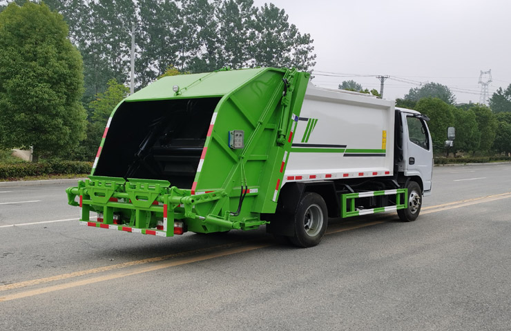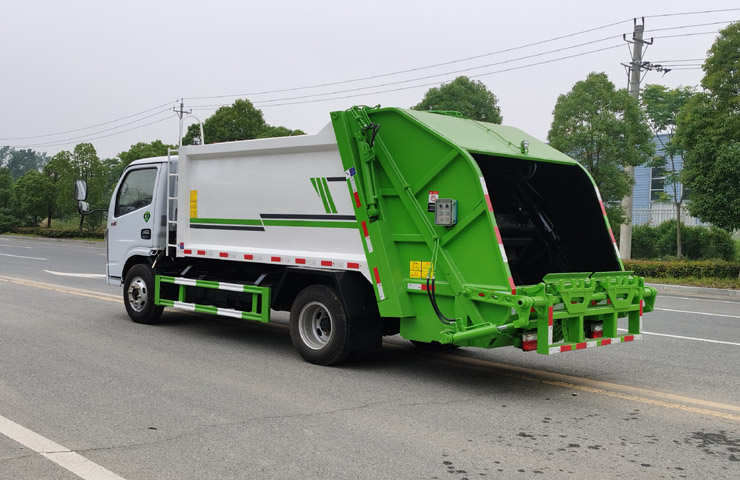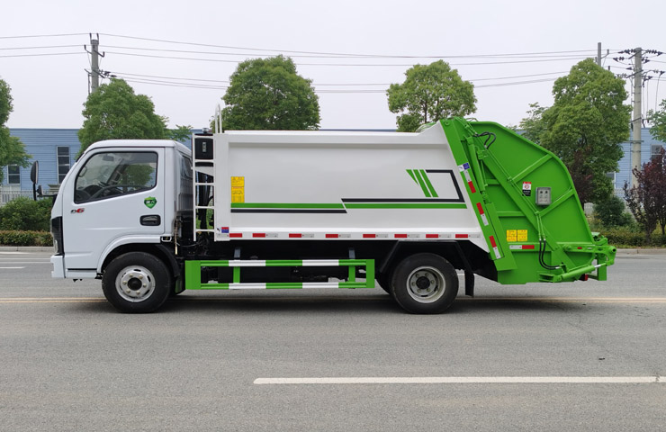 东风国六D6垃圾车- 6方压缩式垃圾车技术参数底盘配置:多利卡D6排驾驶室,国六朝柴130马力发动机(玉柴140马力),轴距3308mm,万里扬5档变速箱,7.00R16钢丝胎,带原装空调,中控锁,电动门窗,ABS,液压方向助力,多功能方向盘,LED日间行车灯。上装配置:弧形箱体,容积约6立方,采用特种钢板制作,箱体底板4mm,边板4mm,博利油缸,中梅多路阀,长源液压油泵,填装器举升油缸带液压锁装置,采用进口西门子PLC电控系统(带一键操作,和手动操作两种控制方式),电控操作盒三只。带2个污水收集箱,尾部带橡胶密封条。填充器加装后照明灯,箱体油漆及喷字按用户要求定制。