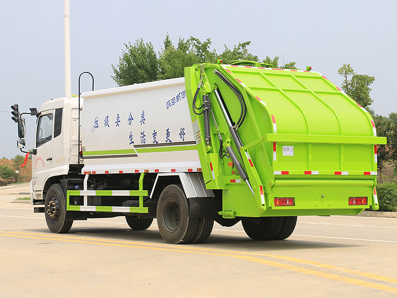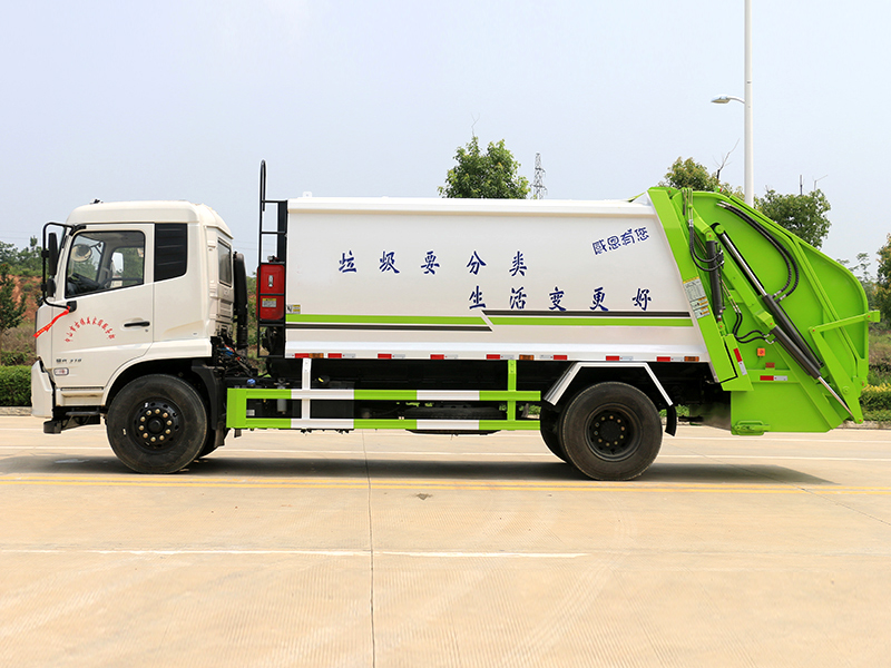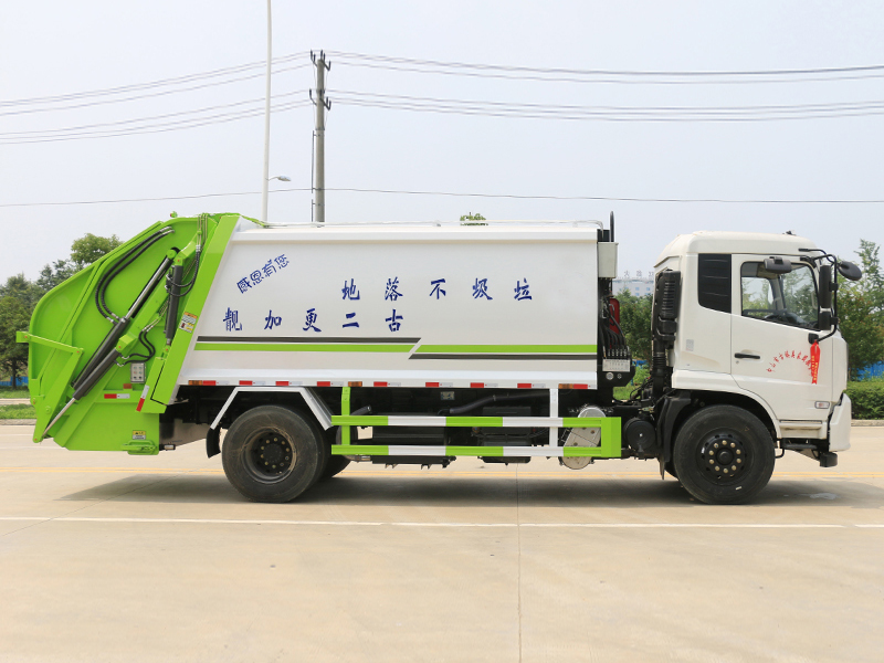 新款平面弧形厢体,厢体材料为武钢优质碳钢,外箱尺寸:8890×2500×3300mm,有效压缩容积12-14立方,PLC一键操作控制,手电一体操作模式,两侧双电控,带驾驶室内操作,底板支撑加强,双向压缩,开放式易清洁污水箱。压缩式垃圾车采用机电液一体化技术,借助机、电、液联合自动控制系统、电脑控制、手动操作系统,通过填装器和推铲等专用装置,实现垃圾倒入、压碎或压扁、强力装填,把垃圾挤入车厢并压实和推卸,污水全部进入污水收集箱,解决了垃圾运输过程中的二次污染的问题。压缩式垃圾车具有自动反复压缩以及蠕动压缩功能,压缩比高、密封性好、装载量大﹑操作方便、环保性好﹑整车利用功率高等优点。