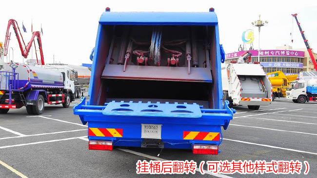 3、压缩式垃圾车带挂桶提升架,可配套使用全国通用铁制挂桶或塑料挂桶、强力装填,把垃圾挤入车厢并压实和推卸。