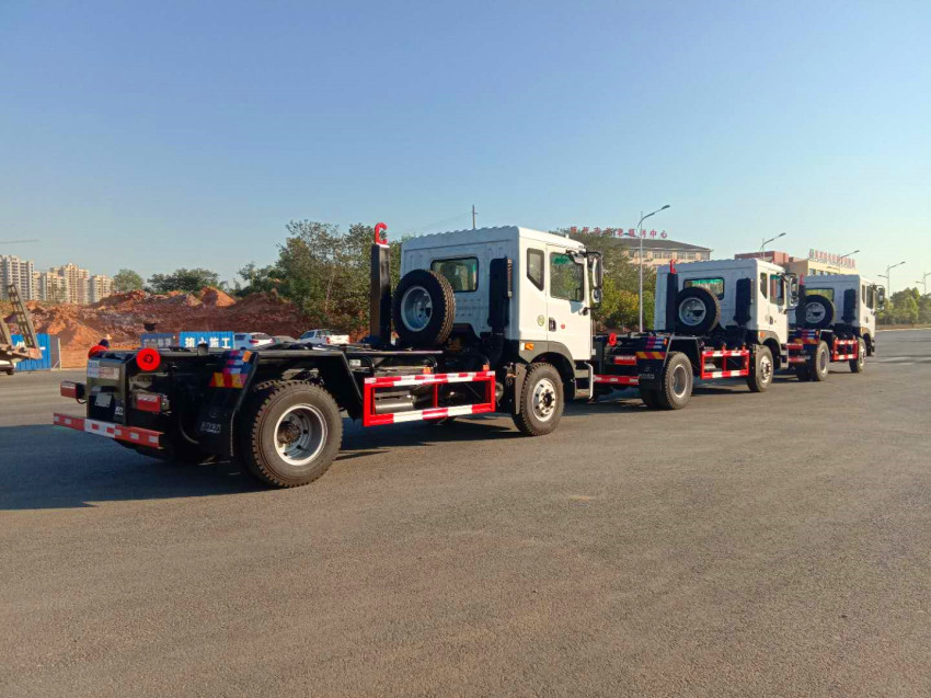 勾臂式垃圾车即车厢可卸式垃圾车、拉臂式垃圾车。该车广泛适用与城市街道学校垃圾处理,可一车配备多个斗,各个垃圾点放置多个垃圾斗,带自卸功能,液压操作,方便倾倒。该车的箱体部分完全由液压系统来控制,在平日里可将车载垃圾箱放置到各个垃圾收集站,待垃圾收集满后,该车可直接开赴至垃圾站,通过液压系统的操控,可将垃圾车后座上加装的勾臂放下,挂住站内垃圾箱前端的连接点,将垃圾箱拉至车体的后座上,此时即可启动车辆,将垃圾运送至垃圾处理站内,进行自卸式倾倒。该车最主要的优点就是可一车配多斗,一辆车就可以维持数个垃圾收集站的运转,效率高,且箱体为密封式设计,不会造成二次污染。