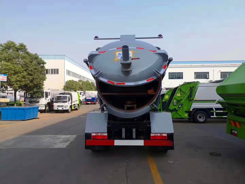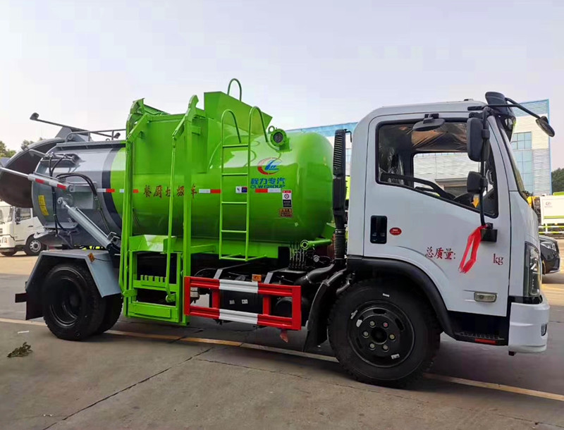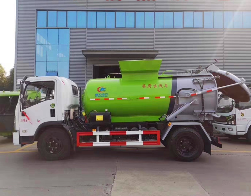 餐厨垃圾车是将桶装泔水经该车输送带缓缓上输,在车顶部倒入车厢内(车厢可分为厢体和罐体),被投放的垃圾经过强有力的推板挤压,然后固液分离,被分离的液体进入罐体底部的污水箱,固体垃圾被压缩储存在罐体,体积变小,如此反复待装满后送至餐厨垃圾资源优化处理厂。整个过程,实现自动化。餐厨垃圾的分类收集,集中处理,不仅需要后期无害化、资源化的处理设备,还需要收集、运输的专用车辆。因餐厨垃圾含水量高、成分复杂等特点,要求车辆密闭性好、操作简便安全,装卸效率高且方便,并要求与后期资源化设备配套。