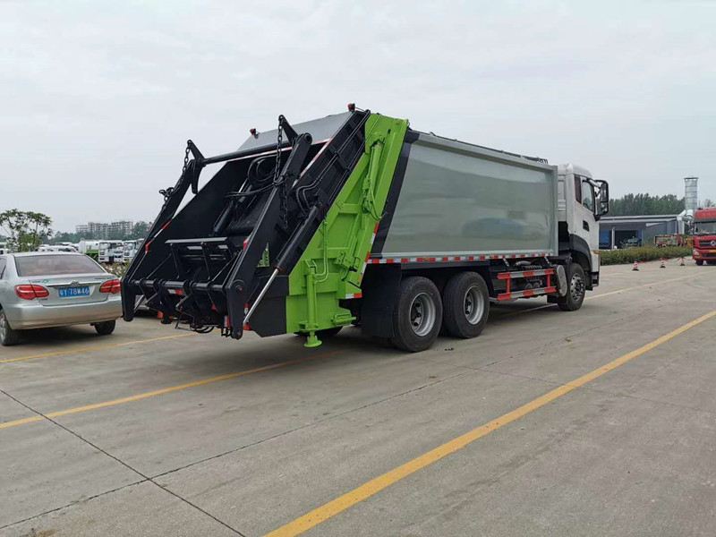 6. 方便的操作控制,作业控制盒分别安装在驾驶室内和车尾左右,驾驶室内的作业控制盒可控制推挤卸料和选择操作模式(如自动或手动),车尾的作业控制盒则控制压填机构和翻桶机构的作业,使用操作十分方便。特别是在垃圾填埋场,作业人员无须下车即可完成卸料和污水排放。