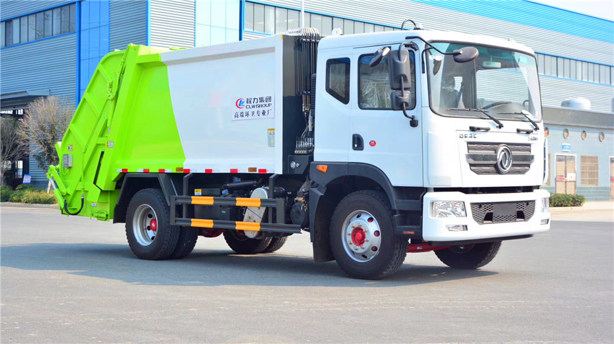 上装配置:新款平面弧形厢体,厢体材料为武钢优质碳钢,有效压缩容积10-12立方,PLC一键操作控制,手电一体操作模式,两侧双电控,带驾驶室内操作,底板支撑加强,双向压缩,开放式易清洁污水箱。压缩式垃圾车采用机电液一体化技术,借助机、电、液联合自动控制系统、电脑控制、手动操作系统,通过填装器和推铲等专用装置,实现垃圾倒入、压碎或压扁、强力装填,把垃圾挤入车厢并压实和推卸,污水全部进入污水收集箱,解决了垃圾运输过程中的二次污染的问题。压缩式垃圾车具有自动反复压缩以及蠕动压缩功能,压缩比高、密封性好、装载量大﹑操作方便、环保性好﹑整车利用功率高等优点。作业自动化,垃圾收集方式简便、高效。后翻转机构选装:1、挂塑料桶式翻转机构;2、挂铁桶式翻转机构;3、摆臂式翻转机构; 4、簸箕斗式翻转机构。