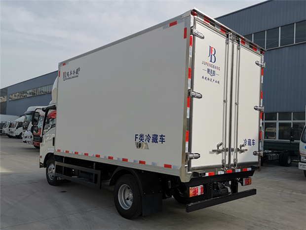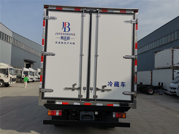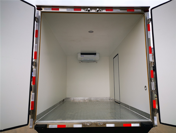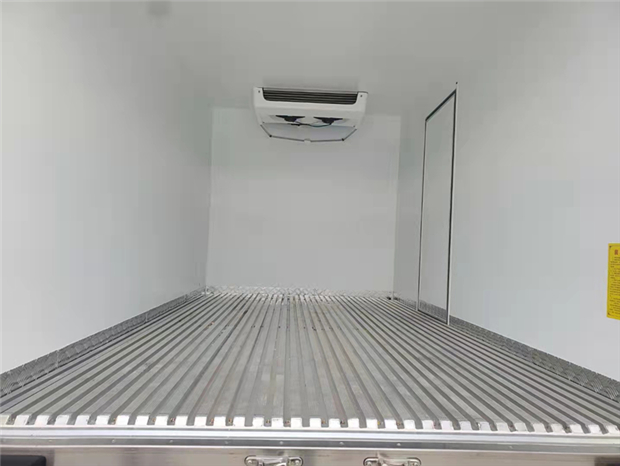 国六庆铃M100蓝牌冷藏车厢体配置为:采用断桥隔热工艺,整体框架结构制作,厢体内、外壁材料为玻璃钢板,采用高密度保温层,厢板内带有骨架,厢体厚度80mm,门框,门饰件、包角全部使用不锈钢材质。最新款铝合金包边型材,厢体内采用LED照明灯及厢体示宽灯;门框密封条为橡胶材质,后门梁带加厚防撞块,加厚型不锈钢铰链及锁件。车体副梁采用510L高强度钢制作,底板为铝花纹板(标配塑钢花纹板,可选铝花纹板,不锈钢板),车厢后门带一个上车扶手,其余标配;