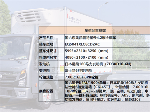 东风星云4米2冷藏车车身配置为:东风K6M1900宽单排驾驶室,东风轻型发动机,型号为:ZD30D16-6N,法士特6档变速箱,型号为:C6J45T,5吨后桥德纳桥,190mm车架,7.00R16LT 8PR轮胎,3/3+2弹簧片,原装空调,电动窗,中控锁,一键升降玻璃,横向稳定杆,ABS,断气刹,多功能方向盘,日间行车灯,蓝牙电话。