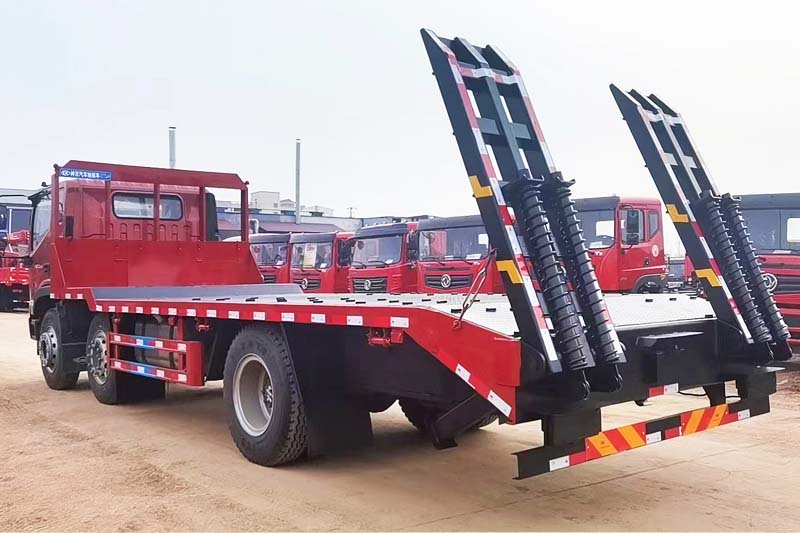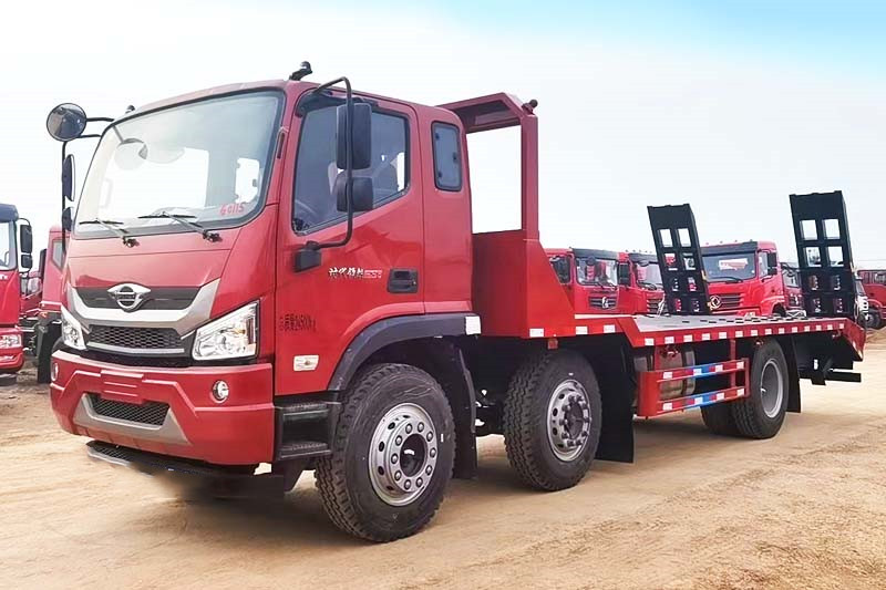 福田前四后四平板拖车,国六排放标准,采用新款瑞沃ES5驾驶室,标配中控锁电动门窗、原厂空调、气囊座椅、定速巡航、ABS等,可定制液压双节折叠爬梯,爬梯长度4米以上,运输叉车等机械设备