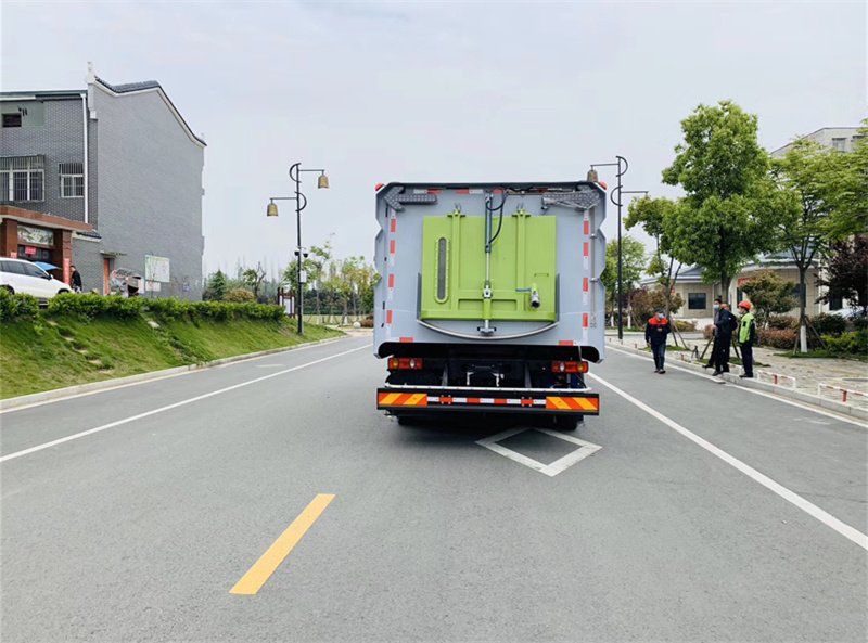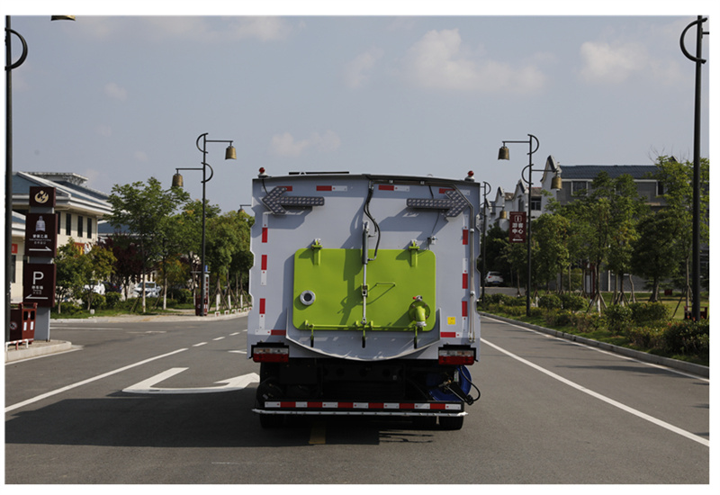 6)具备倒车保护装置,在作业过程中如遇紧急倒车,智能化的控制系统会自动停止作业并收回扫盘、吸盘和侧喷杆;具有防止举升垃圾箱翻车保护;具有检修安全保护。